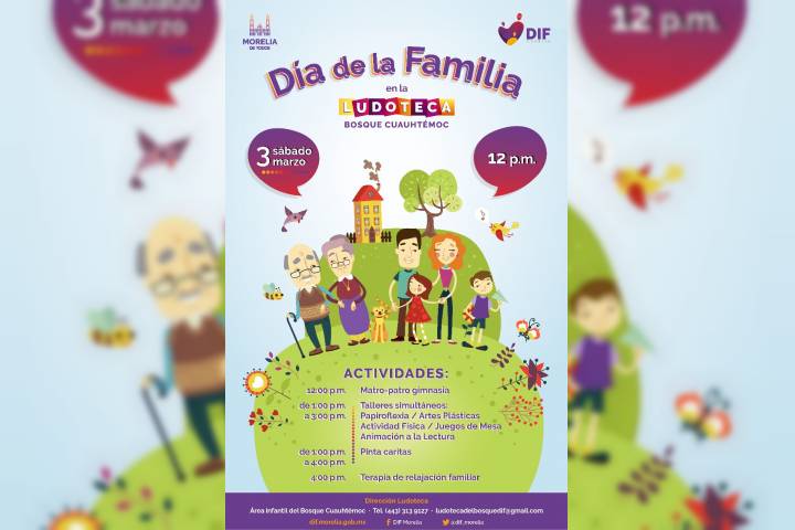 NOTICIAS 02/03/2018DIF Morelia celebrará día de la familia este sábado en la ludotecaFortalecer el núcleo familiar es uno de los principales ejes del Alcalde Alfonso Martínez Alcázar, quien a través del sistema DIF Morelia implementa programas encaminados a la integración y desarrollo de las familias del municipio. Por ello, este sábado 3 de marzo a partir de las 12 del día se celebrará el Día de la Familia, con diversas actividades en la Ludoteca del Bosque Cuauhtémoc.