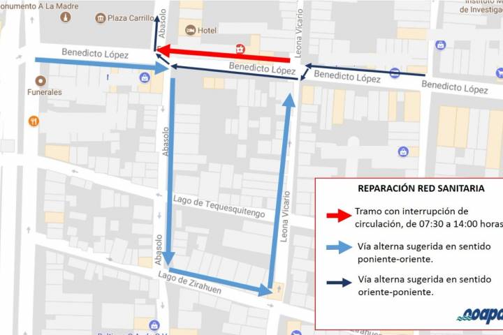 El día de mañana, martes 30 de Enero, el Organismo Operador de Agua Potable, Alcantarillado y Saneamiento de Morelia (OOAPAS) realizará la reparación en la red sanitaria ubicada sobre la calle Benedicto López, en el carril norte, en el tramo que está entre la calle Leona Vicario y la calle Abasolo.