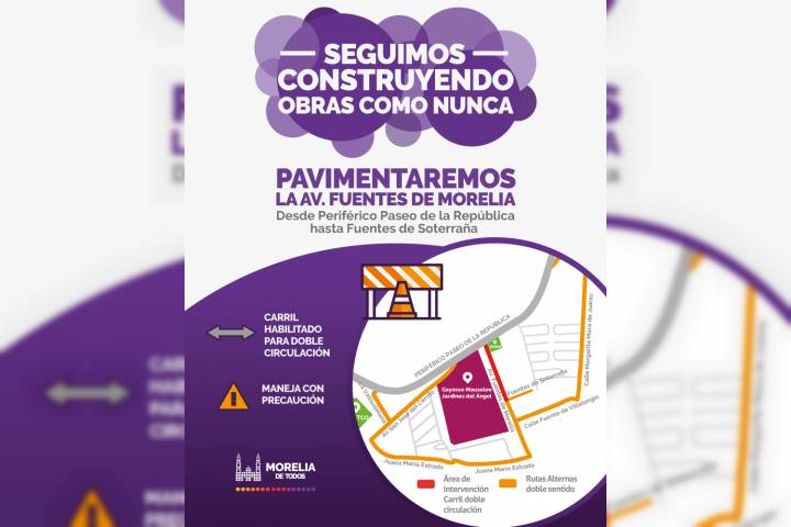 En esta ruta, en los próximos días dará inicio la modernización de la Avenida Fuentes de Morelia, en el tramo que va del Periférico Paseo de la República a la calle Fuente de Soterraña, donde ... Ver más...