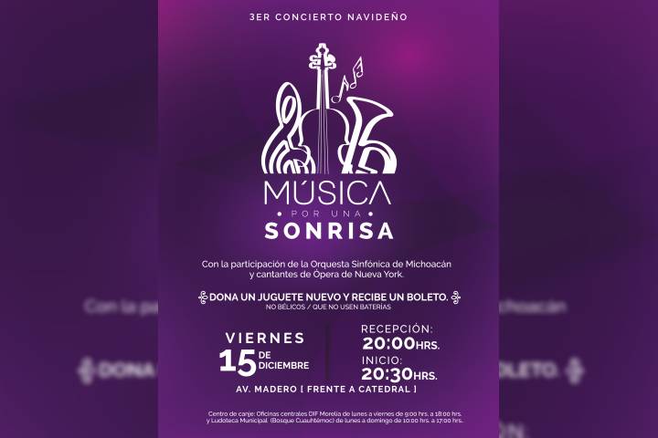 NOTICIAS 07/12/2017DIF Morelia invita a participar en colecta de juguetes del Concierto Navideño "Música por una Sonrisa" Continúa abierta la invitación del DIF Morelia para que la ciudadanía apoye a que miles de niños tengan una gran Navidad, participando con la entrega de un juguete a cambio de un boleto para asistir al Concierto Navideño "Música por una Sonrisa".