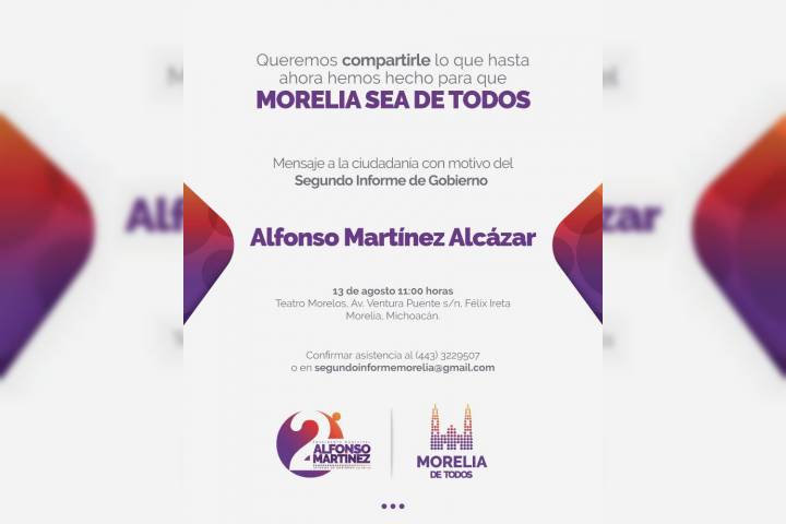 NOTICIAS 12/08/2017Alfonso Martínez invita a la ciudadanía a seguir su 2do Informe de GobiernoUn informe pormenorizado de las políticas, acciones y avances alcanzados a dos años de asumir la primera Presidencia Municipal Independiente de Morelia, rendirá el Alcalde, Alfonso Martínez Alcázar, este domingo 13 de agosto, con motivo del Segundo Informe de Gobierno.