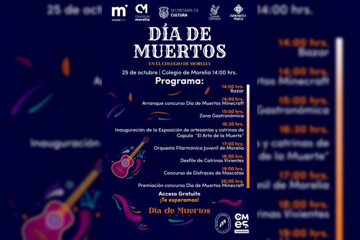 NOTICIAS 21/10/2024Colegio de Morelia ofrecerá programa de arte, cultura y tecnología en su celebración de Día de Muertos El Colegio de Morelia invita a la población en general a disfrutar de su tradicional celebración del Día de Muertos, que se realizará con entrada gratuita el próximo 25 de octubre, como parte de las actividades instruidas por el Presidente Municipal, Alfonso Martínez Alcázar, con el objetivo de impulsar nuestras tradiciones y la convivencia familiar.