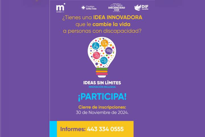 NOTICIAS 22/10/2024DIF Morelia lanza concurso de productos innovadores para personas con discapacidadEl DIF Morelia que encabeza su Presidenta Honoraria, Paola Delgadillo Hernández, invita a la ciudadanía a participar en el concurso "Ideas sin Límites: Innovación Inclusiva", una convocatoria que promueve la creación de productos innovadores que apoyen a personas con discapacidad visual, auditiva o motora, en el marco del Día de la Discapacidad 2024.