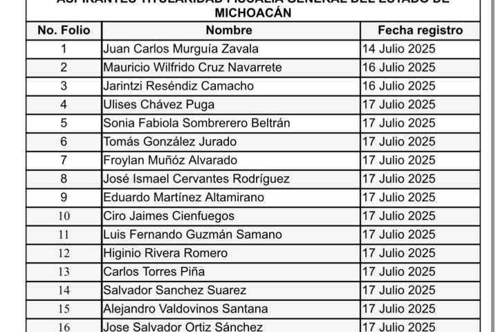 NOTICIAS 26/07/2025Aprueba 76 Legislatura lista de diez aspirantes a Fiscal General del Estado El Pleno del Poder Legislativo, aprobó la relación de los diez aspirantes mejor evaluados para el cargo de titular de la Fiscalía General del Estado de Michoacán, misma que será remitida al Poder Ejecutivo, para de este, forme una terna de la cual, las y los diputados, seleccionarán al nuevo encargado de la procuración de justicia del Estado.