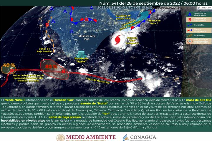 NOTICIAS 28/09/2022Clima por demás inestable en México hoyEste día, el frente Núm. 1 interacciona con el Huracán "Ian", sobre el sureste de los Estados Unidos de América, dejando de afectar al país. La masa de aire frío que lo generó cubrirá gran parte del país y provocará evento de "Norte" con rachas de 70 a 80 km/h en costas de Veracruz e Istmo y Golfo de Tehuantepec, en donde también se preven lluvias torrenciales en Chiapas, además de fuertes a intensas en el sur y sureste del territorio... Ver más...