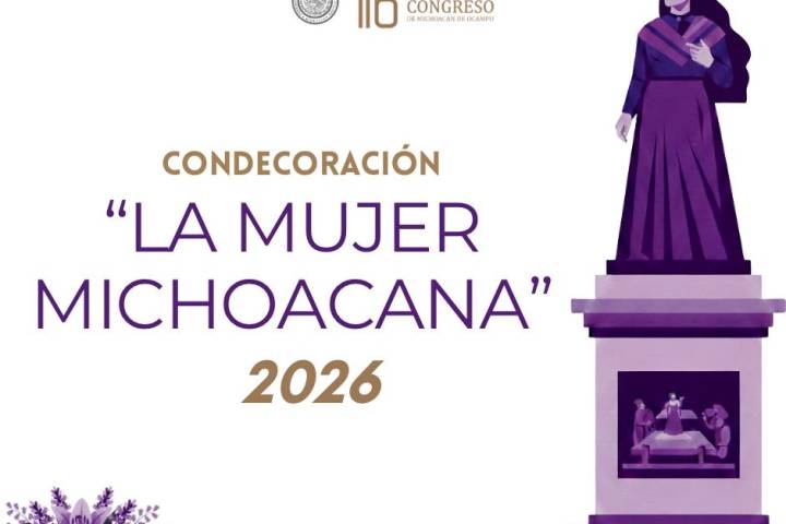 NOTICIAS 13/02/2026Emite Congreso del Estado convocatoria oficial para la Condecoración "La Mujer Michoacana" 2026 Con la premisa de reconocer y visibilizar a las personas, instituciones o asociaciones, que han destacado por realizar trabajos o proyectos en favor de las mujeres michoacanas, el Congreso del Estado, a través de la Comisión de Igualdad Sustantiva y de Género, lanzaron la convocatoria para la Condecoración "La Mujer Michoacana 2026".