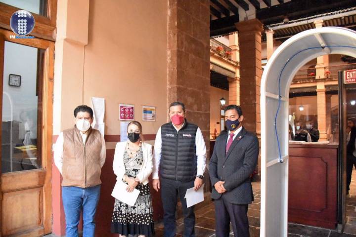 Coincidieron el diputado Juan Carlos Barragán Vélez y la diputada Luz María García García, durante la instalación del arco sanitizante en el acceso principal del Palacio Legislativo, ... Ver más...