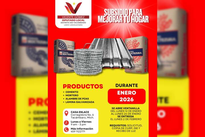 NOTICIAS 23/01/2026Vicente Gómez y el ayuntamiento de Madero unen esfuerzos para subsidiar cemento a la población La atención puntual a las necesidades del pueblo para coadyuvar al bienestar familiar y social, es un compromiso permanente, indicó el diputado por el Distrito XIX con sede en Tacámbaro, Vicente Gómez Núñez.