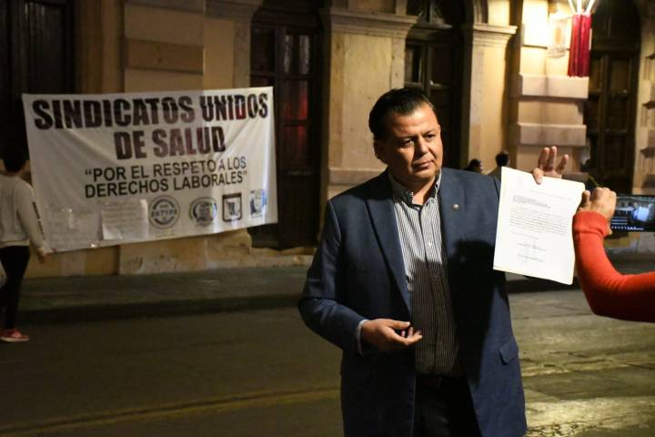NOTICIAS 08/12/2025Memo Valencia exhibe la indolencia de las autoridades estatales al no atender a manifestantes en el Congreso del EstadoComo marcaba la cita, el diputado priista, Memo Valencia llegó a la sesión extraordinaria en el recinto del Congreso del Estado, pero se encontró cerradas las puertas del Poder Legislativo por la toma de trabajadores de distintos sindicatos de la Salud, que exigen ser escuchados y atendidos en sus demandas de corte laboral.