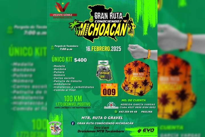 NOTICIAS 16/01/2025Invita Vicente Gómez a la "Gran Ruta Conociendo Michoacán"El diputado por el Distrito XIX, con cabecera en Tacámbaro, Vicente Gómez Núñez, hizo una invitación a toda la población, en especial a los aficionados al ciclismo a participar en la "Gran Ruta Conociendo Michoacán", la cual se realizará el próximo 16 de febrero.