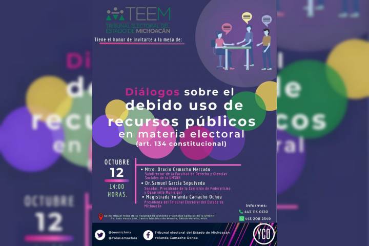 NOTICIAS 11/10/2019TEEM realizará "Diálogos sobre el debido uso de recursos públicos en materia electoral"Con el objetivo de reforzar la confianza con la sociedad, a través del desarrollo de buenas prácticas basadas en la transparencia y rendición de cuentas, este sábado 12 de octubre se realizará el evento: "Diálogos sobre el debido uso de recursos públicos en materia electoral", convocado por el Tribunal Electoral del Estado de Michoacán, a través de la Magistrada Presidenta Yolanda Camacho Ochoa.