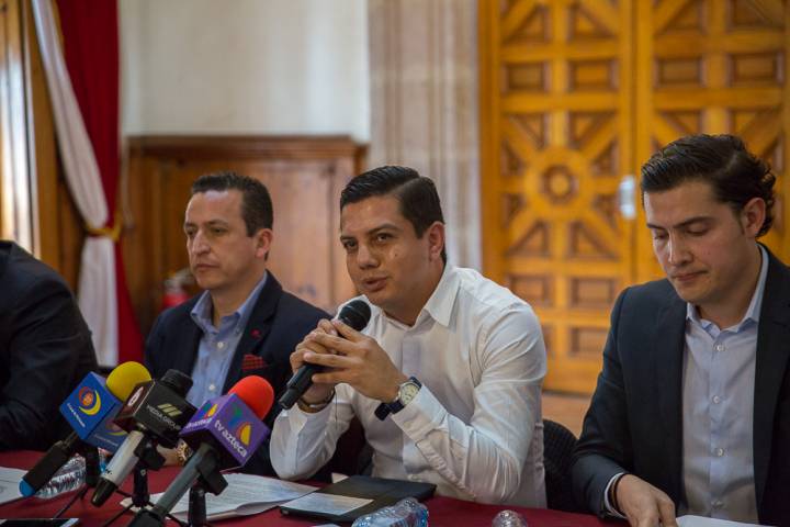 Los integrantes de la Jucopo, Alfredo Ramírez Bedolla (Morena), Javier Estrada Cárdenas (PAN), Adrián López Solís (PRD), Eduardo Orihuela Estefan (PRI), Brenda Fraga Gutiérrez (PT), Ernesto Núñez Aguilar (PVEM), y José Anton... Ver más...