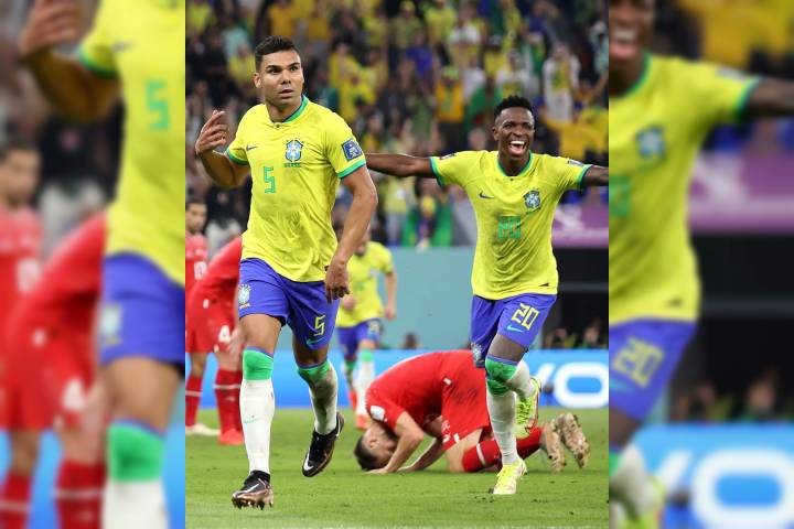 NOTICIAS 28/11/2022Brasil encamina clasificación Casemiro de Brasil celebra con sus compañeros de equipo después de marcar el primer gol de su equipo durante el partido del Grupo G de la Copa Mundial de la FIFA Qatar 2022 entre Brasil y Suiza en el Estadio 974 el 28 de noviembre de 2022 en Doha, Qatar.