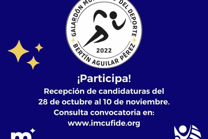 NOTICIAS 28/10/2022Imcufide abre convocatoria para la entrega del Galardón Municipal del Deporte 2022Con la finalidad de reconocer a las y los deportistas morelianos, el Instituto Municipal de Cultura Física y Deporte (Imcufide) dio a conocer que del 28 de octubre y hasta el 10 de noviembre estará abierta la convocatoria para participar en el Galardón Municipal del Deporte "Bertín Aguilar Pérez", en su edición 2022.