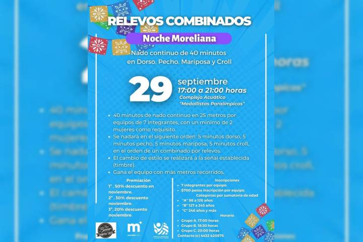 NOTICIAS 28/09/2022Todo listo para la "Noche Moreliana de Relevos" en INDECOCon la finalidad de integrar al deporte al programa de actividades patrias y generar un ambiente de sana convivencia a través de la competencia, el Instituto Municipal de Cultura Física y Deporte (Imcufide), se reporta listo para el evento de relevos combinados que se realizará en el Complejo Acuático "Medallistas Paralímpicos", de la Unidad Deportiva Morelos INDECO.
