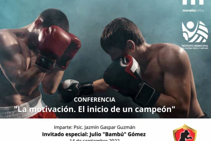 NOTICIAS 12/09/2022IMCUFIDE y Club de Box Guerreros Morelia realizará una charla de psicologíaBajo el slogan "Motivación, el Inicio de un Campeón", el Club de Box Guerreros, en coordinación con el Gobierno de Morelia, vía el Instituto Municipal de Cultura Física y Deporte (Imcufide), realizará una charla de psicología encabezada por Jazmín Gaspar Guzmán, misma que habrá de celebrarse el miércoles 14 del presente mes, en punto de las 17:00 horas, en la Unidad Deportiva Morelos-INDECO.