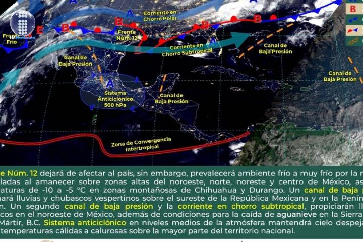 NOTICIAS 08/12/2021El frente frío número 12 dejará de afectar el país, sin embargo las bajas temperaturas seguirán Es importante que te cuides de las bajas temperaturas, pues este miércoles 08 de diciembre, el frente Núm. 12 dejará de afectar al país, sin embargo, prevalecerá ambiente frío a muy frío por la mañana y heladas al amanecer sobre zonas altas del noroeste, norte, noreste y centro de México, así como temperaturas de -10 a -5 °C en zonas montañosas de Chihuahua y Durango.