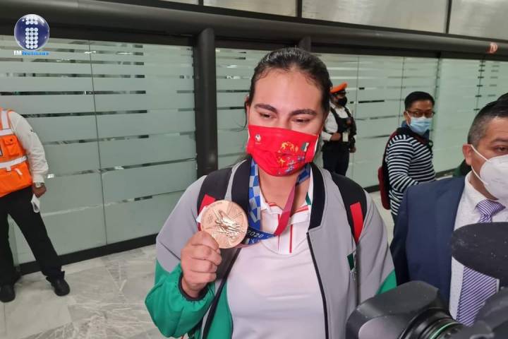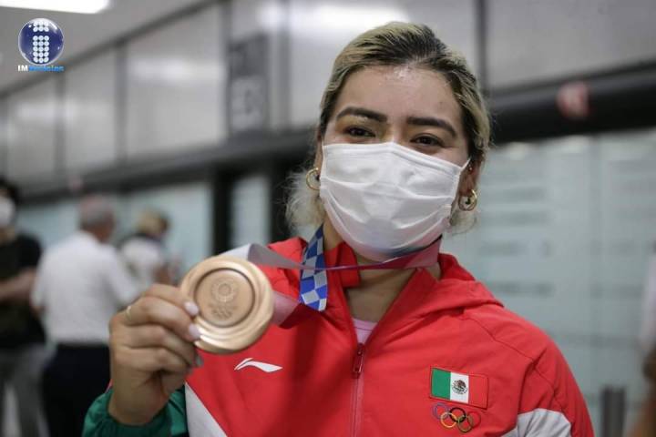 La halterista Aremi Fuentes regreso a México con una medalla de bronce que consiguió en los Juegos Olímpicos de Tokyo 2020, en la categoría de 76 kilogramos.