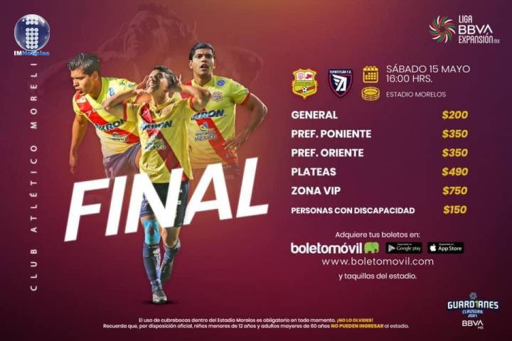De 200 a 750 pesos oscila el costo de los boletos para asistir al juego de Vuelta de la Gran Final del torneo Guard1anes 2021 de la Liga Expansión MX, entre los Canarios del Atlético Morelia y los Alteños de Tepatitlán, a celebrarse el próximo sábado en punto de las 16:00 horas, sobre la cancha del estadio Morelos. Así lo dio a conocer el club michoacano a través de sus redes sociales.