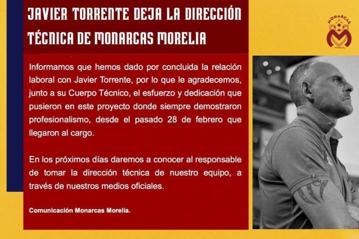 Con solo dos juegos ganados de trece oficiales, la Directiva del Club Monarcas Morelia le aplicó la guillotina al estratega argentino Javier Torrente, tras caer la noche de anoche 1-0 ante las Águilas del América. De forma interina se quedan como responsables Luis Orozco y Esteve Padilla, de cara al duelo frente a los Pumas, correspondiente a la fecha 6 del Apertura 2019 de la Liga MX.