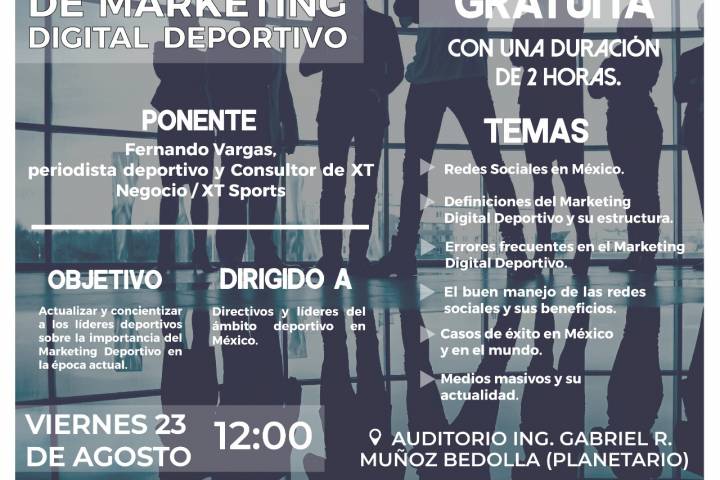 NOTICIAS 20/08/2019Invitan a Seminario de Marketing Digital DeportivoEn busca de dotar de herramientas útiles a directivos y líderes del ámbito deportivo, la Comisión Estatal de Cultura Física y Deporte (Cecufid) invitan al Seminario de Marketing Digital Deportivo, a celebrarse el próximo viernes 23 de agosto en punto de las 11:00 de la mañana, en el Planetario de esta ciudad.