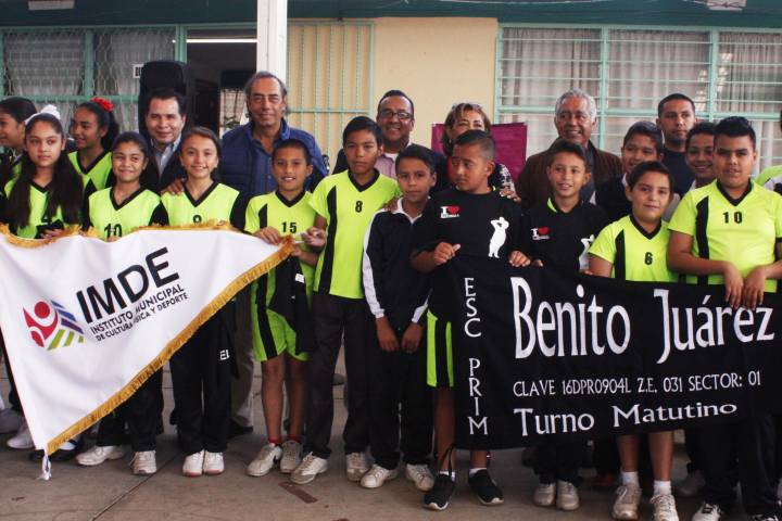 Con miras a la etapa estatal de los Juegos Nacionales de la Educación Básica, a celebrarse del 14 al 16 de marzo en el municipio de Tingüindín, Michoacán, este día en el patio principal de la Escuela Primaria "Benito Juárez", autoridades del Ayuntamiento de Morelia abanderaron a los equipos de balonmano