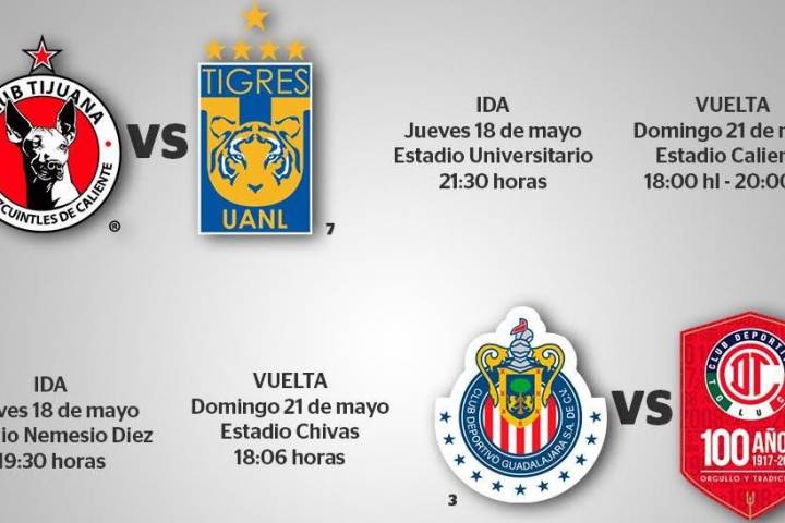Los días jueves y domingo habrán de dirimirse los juegos de ida y vuelta de la fase de Semifinales del torneo Clausura 2017 de la Liga MX, en la cual intervendrán los clubes: Toluca, Guadalajara, Tigres y Tijuana.
