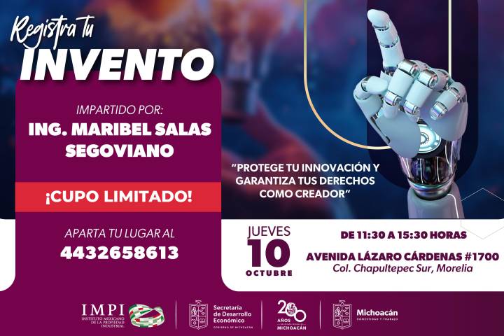 NOTICIAS 18/09/2024¿Tienes un invento? El IMPI y la Sedeco te dicen cómo registrarlo Si tienes un invento o una idea innovadora, el Instituto Mexicano de la Propiedad Industrial (IMPI) y la Secretaría de Desarrollo Económico (Sedeco) te dicen cómo proteger tu invención en una capacitación gratuita.