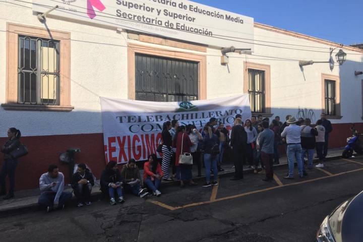 Para exigir el pago inmediato del retroactivo al 100% a los 126 docentes de 43 planteles de Telebachillerato Comunitario de 33 municipios, los afectados de dicho subsistema de manifiestan afuera Subsecretaría de Educación Media Superior.
