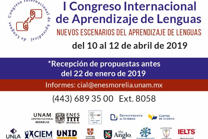NOTICIAS 19/01/2019Primer Congreso Internacional de Aprendizaje de LenguasLa ENES Unidad Morelia, a través del Centro de Auto Acceso - Mediateca, con el apoyo del Departamento y Centro de Idiomas, así como del Centro Cultural de la UNAM en Morelia, la Universidad Latina de América, The Anglo, la Universidad Interamericana para el Desarrollo, (UNID) el Instituto Angloamericano de Morelia, la editorial Stanford Publishing, Cambridge Assessment, la Escuela Normal Motolinia y el Centro de Investigación y Estudios Matem... Ver más...