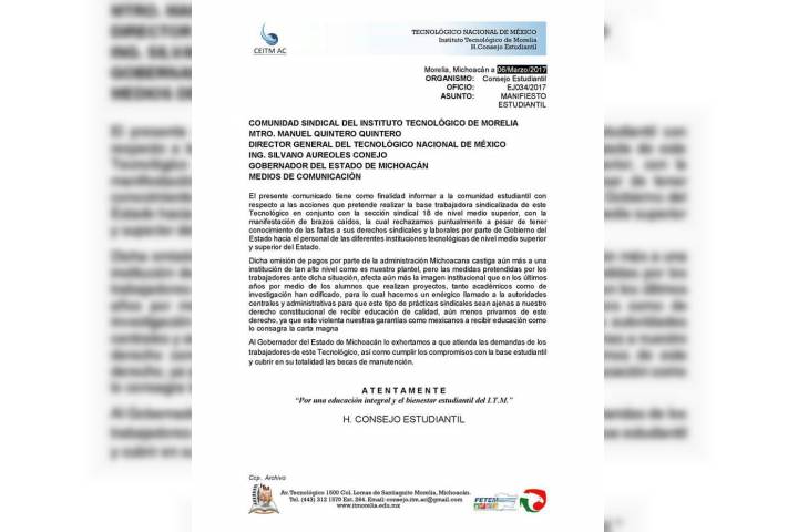 Contrario a su costumbre de cumplir con la totalidad de los dÃas de clases marcados en el calendario oficial, este lunes maestros del Instituto Tecnológico de Morelia (ITM) realizarán un "paro de brazos caÃdos" debido a la falta de pago de bonos algunos de los cuales están pendientes desde el año 2015 no solamente a los docentes del Tecnológico de Morelia, sino a los maestros de los diferentes subsistemas como CET... Ver más...