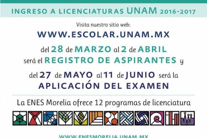 NOTICIAS 08/03/2017UNAM abrirá el próximo 28 de marzo el periodo de inscripción al examen de admisión para licenciaturaEl próximo 28 de marzo comenzará el periodo de registro para presentarse al proceso de selección para ingresar a cualquiera de las licenciatura que ofrece la Universidad Nacional Autónoma de México (UNAM). La aplicación del examen se llevará a cabo entre el 27 de mayo y el 11 de junio. Para presentarlo, los interesados deberán registrarse en la página www.escolar.unam.mx antes del 2 de abril.