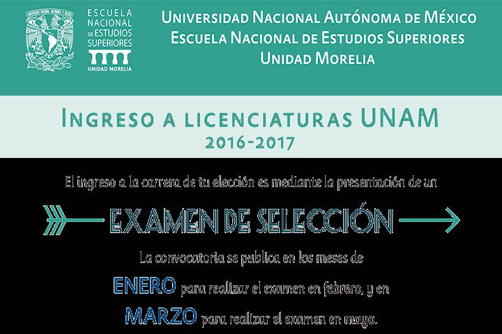 NOTICIAS 06/01/2017Abre la convocatoria para el examen de selección para ingreso a licenciatura en la UNAMEl día de mañana 7 de enero y hasta el 15 del mismo mes, estará abierta la convocatoria para presentar el examen de admisión para ingresar a cualquiera de las 118 licenciaturas que actualmente ofrece la UNAM. La Escuela Nacional de Estudios Superiores Unidad Morelia ofrece 12 licenciaturas en las áreas de físico matemáticas, químico biologías, sociales y artes y humanidades.