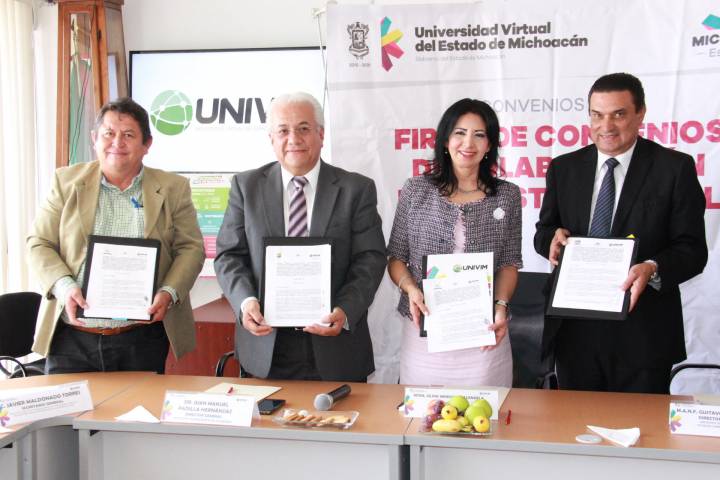 NOTICIAS 13/09/2016Univim suma esfuerzos en pro de los trabajadoresCon el objetivo de formalizar las acciones de vinculación en el intercambio académico, la Universidad Virtual del Estado de Michoacán (Univim) signó un convenio de colaboración interinstitucional con los institutos tecnológicos de Estudios Superiores de Zamora (ITESZ) y de La Piedad (ITPIEDAD) y el Sindicato Único de Trabajadores del Organismo Público Descentralizado de Servicios de Salud de Michoacán (SUTOPDSSM).
