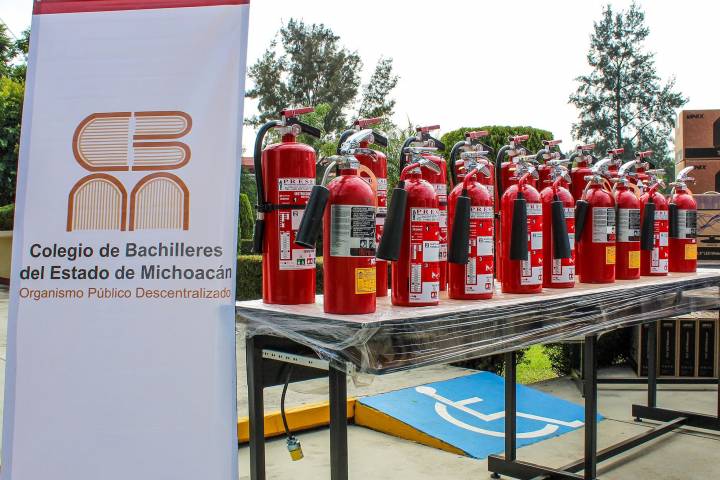 El director general del Colegio de Bachilleres del Estado de Michoacán (Cobaem), Alejandro Bustos Aguilar, entregó 210 extintores que mejorarán las condiciones de seguridad y de prevención de todos los planteles y unidades administrativas del subsistema.