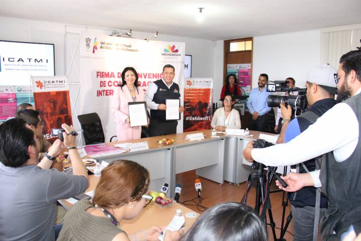 NOTICIAS 28/03/2016Univim e Icatmi unen esfuerzos en favor de la profesionalización En atención a uno de los principales compromisos del Gobernador de Michoacán, Silvano Aureoles Conejo, como lo es contar con funcionarios públicos más y mejor preparados, la Universidad Virtual de Michoacán (Univim) y el Instituto de Capacitación para el Trabajo del Estado de Michoacán (Icatmi) firmaron un convenio de colaboración interinstitucional con la finalidad de llevar a cabo el intercambio académico y capacitación en beneficio d... Ver más...