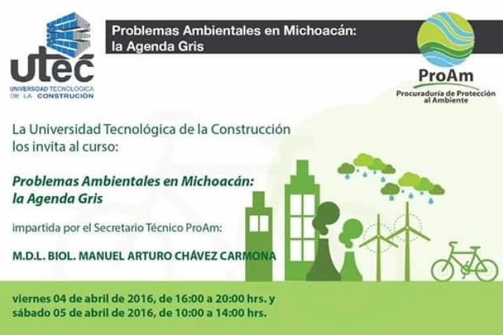 El curso se denomina "Problemas ambientales en Michoacán: La agenda gris", que impartirá la ProcuradurÃa de Protección al Ambiente en las instalaciones de la institución, este viernes de las 16:00 a las 20:00, con continuac... Ver más...