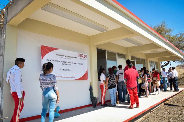 El director general del Colegio de Bachilleres del Estado de Michoacán (Cobaem), Alejandro Bustos Aguilar, en compañÃade autoridades federales y municipales, inauguró dos aulas educativas en la tenencia de Francisco Villa, del municipio de Zinapécuaro.