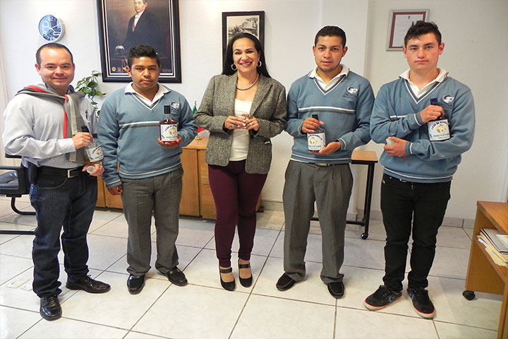 Jóvenes estudiantes del Centro de Educación Media Superior a Distancia (Cemsad), de Las Pitahayas del municipio de Indaparapeo, visitaron a la directora general del Colegio de Estudios Científicos y Tecnológicos del Estado de Michoacán (CECyTEM), Carmen Escobedo Pérez, para informarle sobre el trabajo de elaboración de licor de membrillo que realizan en su centro educativo.