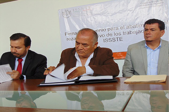 Con el objetivo de abatir el rezago educativo en el Instituto de Seguridad y Servicios Sociales de los Trabajadores del Estado (ISSSTE), el Lic. Rolando López Villaseñor, Director General del Colegio de Bachilleres del Estado de Michoacán (COBAEM) y el Mtro. Adrián Avellaneda Hernández, Delegado Estatal de dicha institución de salud firmaron este día un convenio interinstitucional.