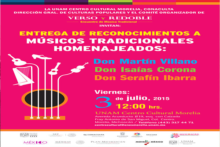 El Encuentro Verso y Redoble que se realiza cada año en la UNAM Centro Cultural Morelia ha logrado generar un espacio para la revitalizaicón de la música, la poesía y el baile tradicionales de las regiones culturales de México. Este viernes 3 de julio a las 12:00 horas, el comité organizador de dicho encuentro entregará reconocimientos económicos a los maestros que han sido homenajeados en las dos primeras ediciones del evento.