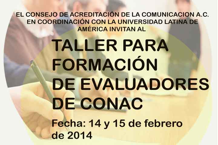 La Universidad Latina de América y el Consejo de Acreditación de la Comunicación A.C, tienen el agrado de coordinar e invitar al Taller para Formación de Evaluadores de CONAC, dirigido a profesores, investigadores o personal administrativo de licenciaturas que se desenvuelvan en programas académicos en ciencias de la comunicación o afín, y que deseen especializarse como pares evaluadores de programas educativos relacionados con el área ... Ver más...