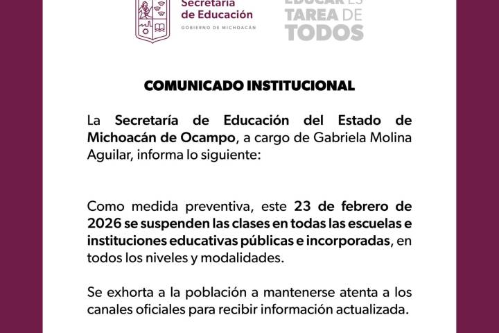 Morelia, Michoacán, 22 de febrero de 2026.- La secretaria de Educación del Estado, Gabriela Molina, informa que este lunes 23 de febrero se suspenden clases en todos los planteles públicos e incorporados de Michoacán, como medida preventiva y con el objetivo de resguardar la integridad de niñas, niños, jóvenes, docentes y trabajadores de la educación.