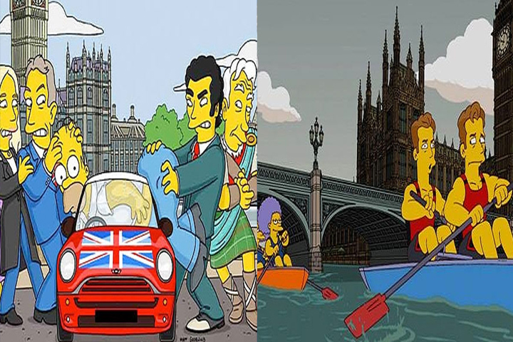 Patty y Selma, las hermanas de Marge Simpson y fumadoras compulsivas en la serie de dibujos animados, compitieron con los gemelos Cameron y Tyler Winklevoss (EU), quienes compitieron en Pekin 2008. La prueba de remotranscurrió sobre el río Támesis y con el Big Ben de fondo.
