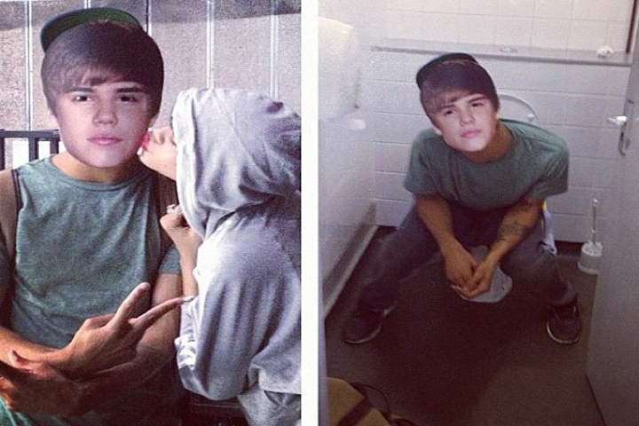 Las dos fotografías muestran al falso Justin Bieber, en una Rihanna le da un beso en la mejilla, pero en la otra está sentado en una poceta.... Ver más...