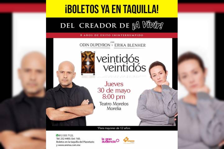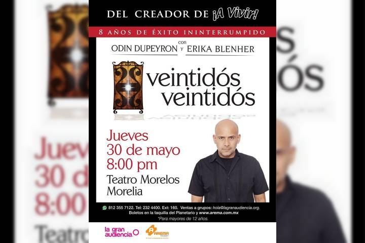 El escritor y autor Odín Dupeyrón, regresará a Morelia junto a Erika Blenher para presentar su obra "Veintidós Veintidós", el próximo jueves 30 de mayo con una única función a las 20:00 horas en el Teatro Morelos. Con ocho años ininterrumpidos de éxito, el también Director mexicano desarrolla a través de dos personajes, que indistintamente pueden ser hombres o mujeres; logran enfrentar al público con la muerte con un humor negro...