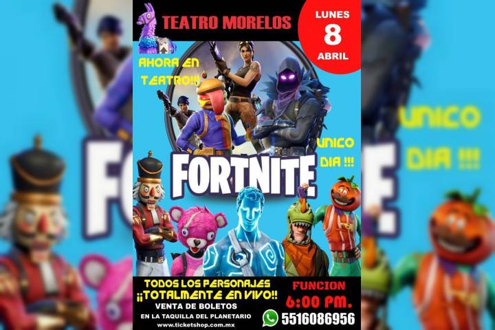 NOTICIAS 24/03/2019Fortnite llega a Morelia con todos sus personajes en Abril Fortnite, el videojuego más famoso del mundo llega por primera vez al Teatro Morelos con su espectáculo original para niños y gamers el próximo 8 de abril con una sola función en punto de las 18:00 horas.