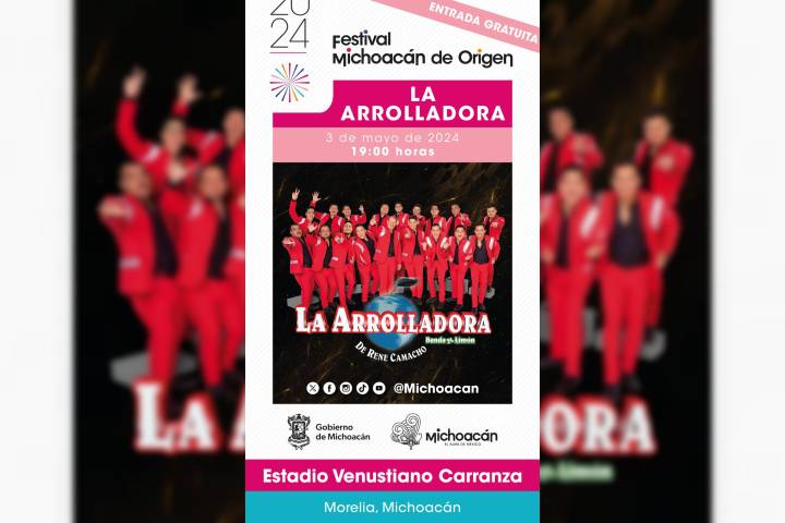 NOTICIAS 01/05/2024Este viernes La Arrolladora llega gratis al Venustiano; esto es lo que debes saberLa Arrolladora llega el viernes 3 de mayo al Estadio Venustiano Carranza del Deportivo Ejército de la Revolución, como parte del elenco artístico del Festival Michoacán de Origen (FMO).