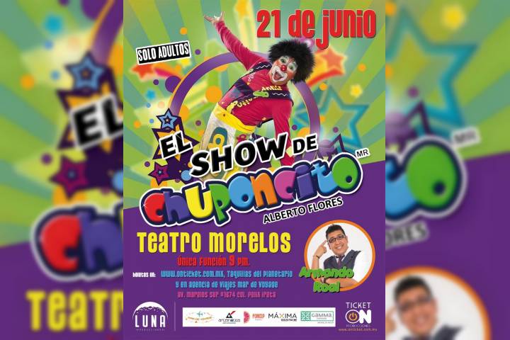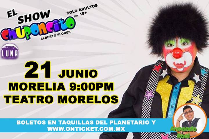 En esta ocasión Alberto Flores, mejor conocido como Chuponcito ha decidido regresar a Morelia con el respaldo de Luna Producciones y la cita es el próximo 21 de junio en el Teatro Morelos con una sola función que será en punto de las 2... Ver más...