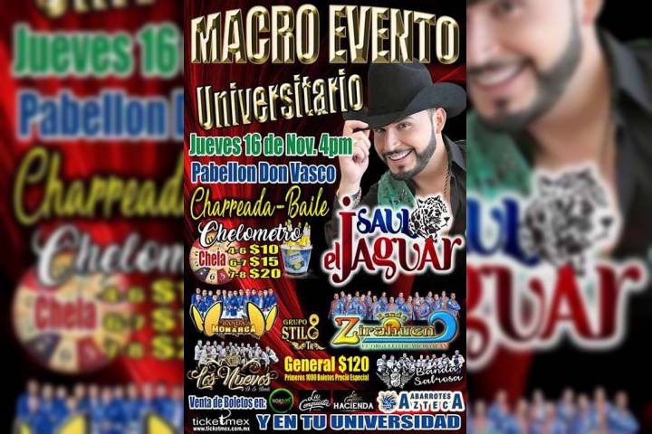 NOTICIAS 16/11/2017Saúl "El Jaguar" se presentará esta noche en un macro evento universitario de MoreliaSaúl "El Jaguar" Alarcón, se presentará en el Pabellón Don Vasco de Morelia la noche de este jueves, como parte de un macro evento universitario.